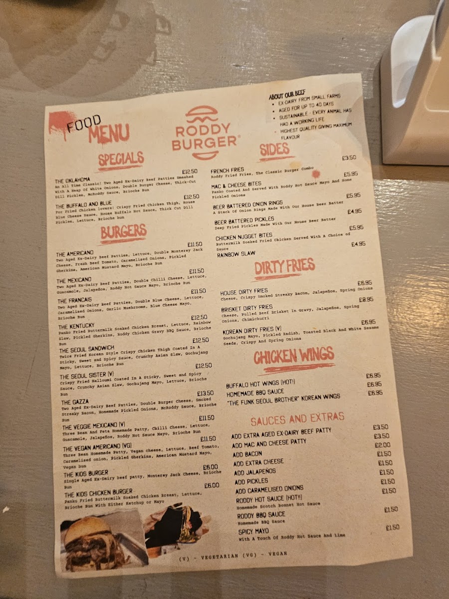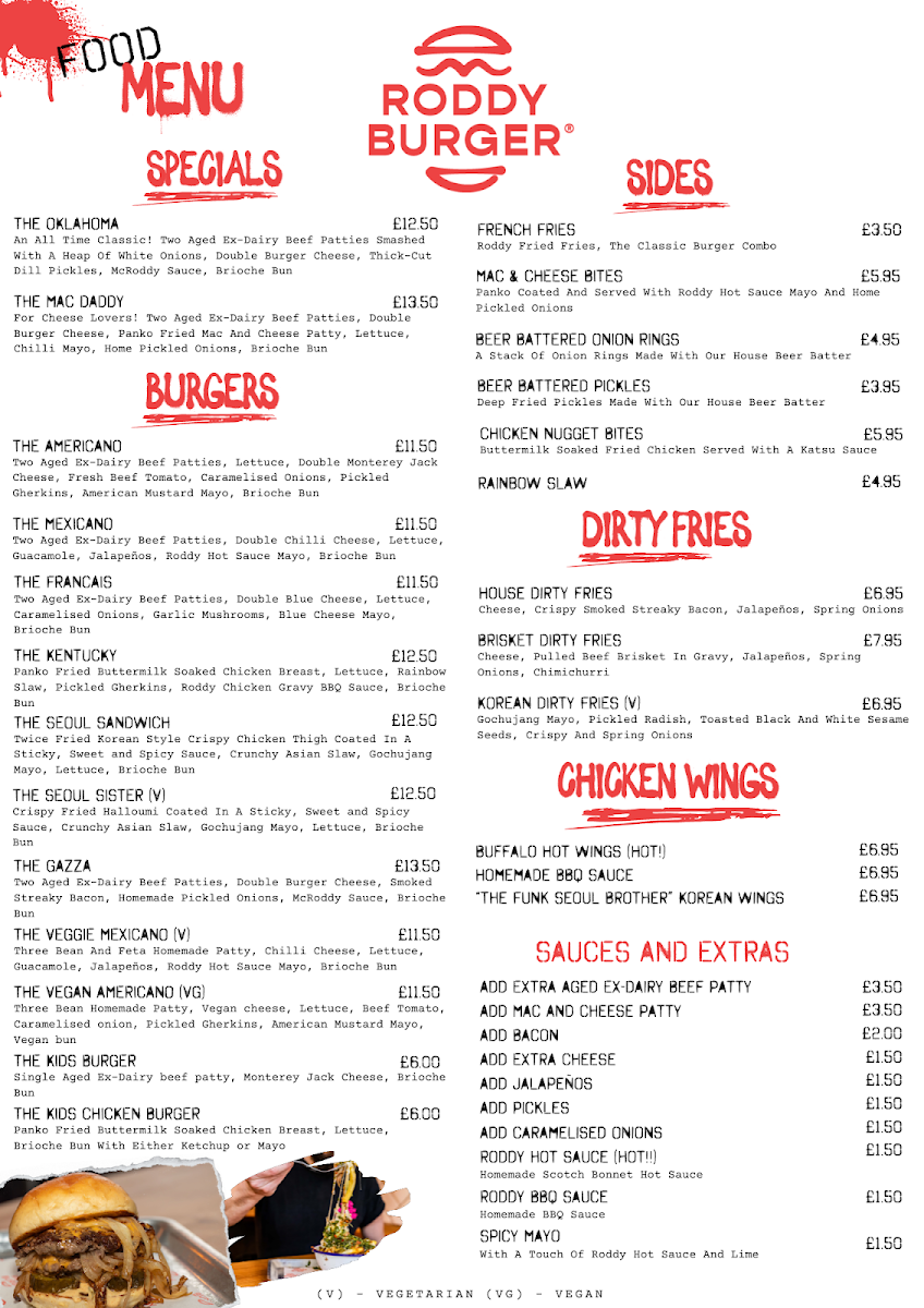 Roddyburger also caters to younger diners with delightful options, including The Kids Burger and The Kids Chicken Burger, priced affordably at £7.00 each. Don’t overlook the Dirty Fries, which have gained a cult following—take your pick from tantalizing variations like Brisket Dirty Fries or Korean Dirty Fries.